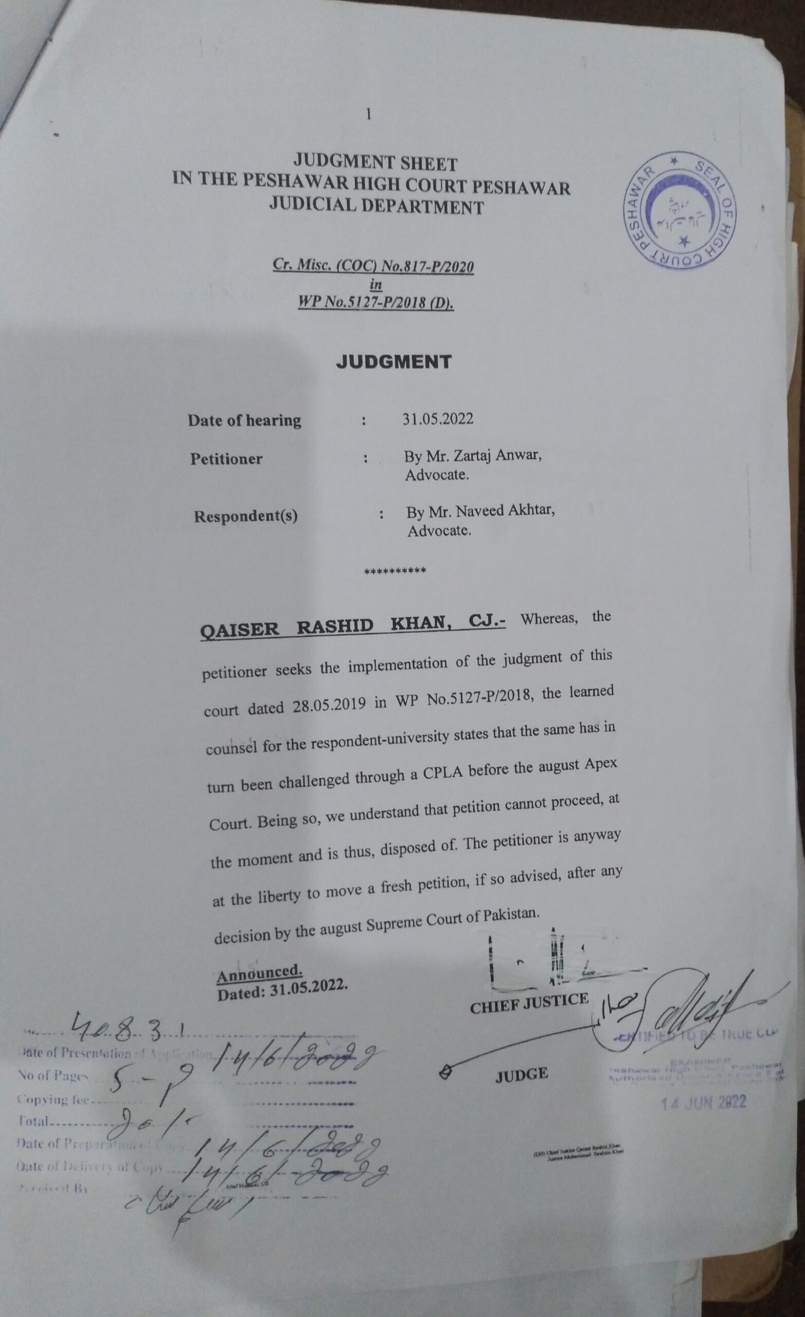 COC Judgement in WP No.5127-P/2018 of Prof M Subhan Qureshi against the University of Agriculture Peshawar (UAP) disposed of the petition. Grievances Committee of UAP costituted subsequent to the Order Sheet of the Honorable Peshawar High Court dated 9-9-2025 issued under WP-59-P/2024, filed by 72 aggrieved retired employees of UAP, denied pension benifits of Prof Qureshi although he possesses 22 years government service verified by AG Office, Govt of KP and 14 years at UAP. The Committees’ Recommendations contradicts Judgement of the Superme Court of Pakistan dated 21,02.2013 in Civil Appeal No.48 of 2013, circulated by the Government of Pakistan, Finance Division, via letter No.F.11(1)-Reg.6/2013 dated 3.5.2013 directing to finalize the pension cases in no more than two weeks without fail. In case of any delay in finalization of the pension benifit cases, if the matter is brought into the notice of this Court, the head of the concerned department shall be held liable for the contempt of court and shall be dealt with strictly in accordance with law.