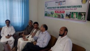 A meeting was held at the University of Agriculture Peshawar to finalize the Khyber Pakhtunkhwa Livestock Policy prepared by Prof Dr Muhammad Saleem Chaudhry on advise of the ruling party. The meeting was hosted by the Dairy Science Park and participated by representatives of the Director Generals Livestock and Dairy Development Department (Extension and Research Wings), Dean FAHVS, The University of Agriculture Peshawar and the private sector represented by the Dairy Science Park. The education and private sectors were represented as follows: